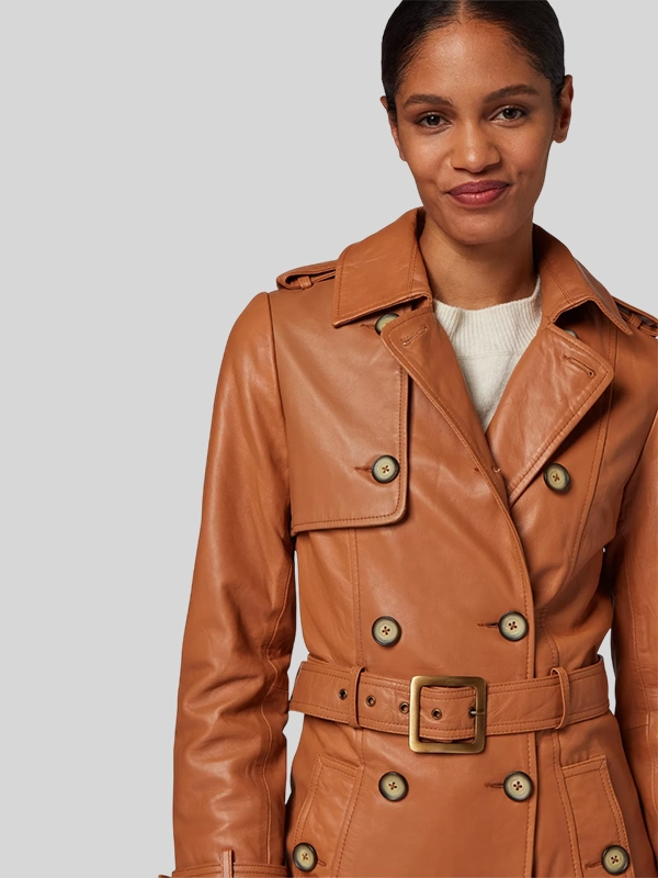 Double Breasted Brown Belted Leather Trench Coat For Women’s