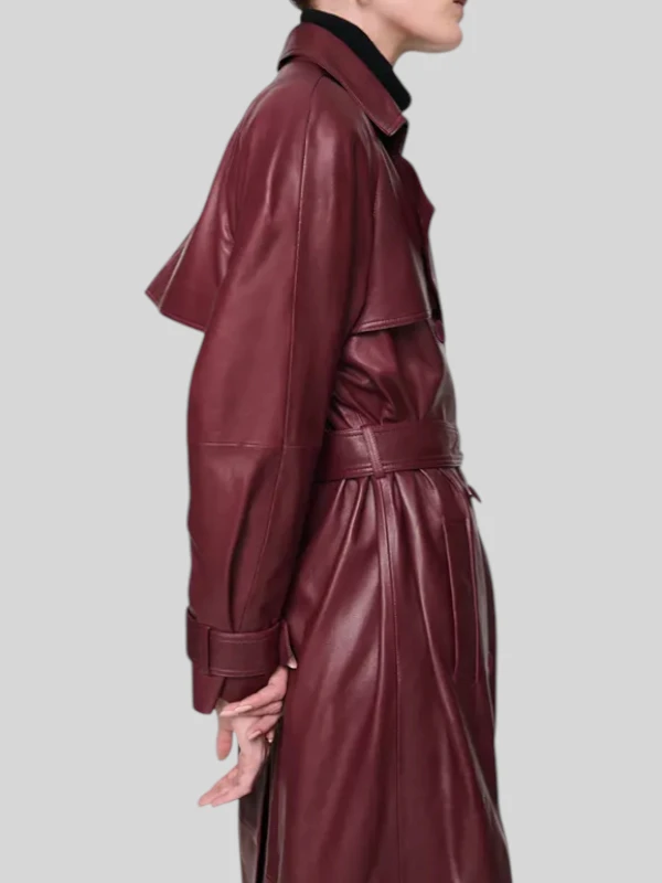 Double Breasted Corrin Leather Trench Burgundy Coat For Women’s