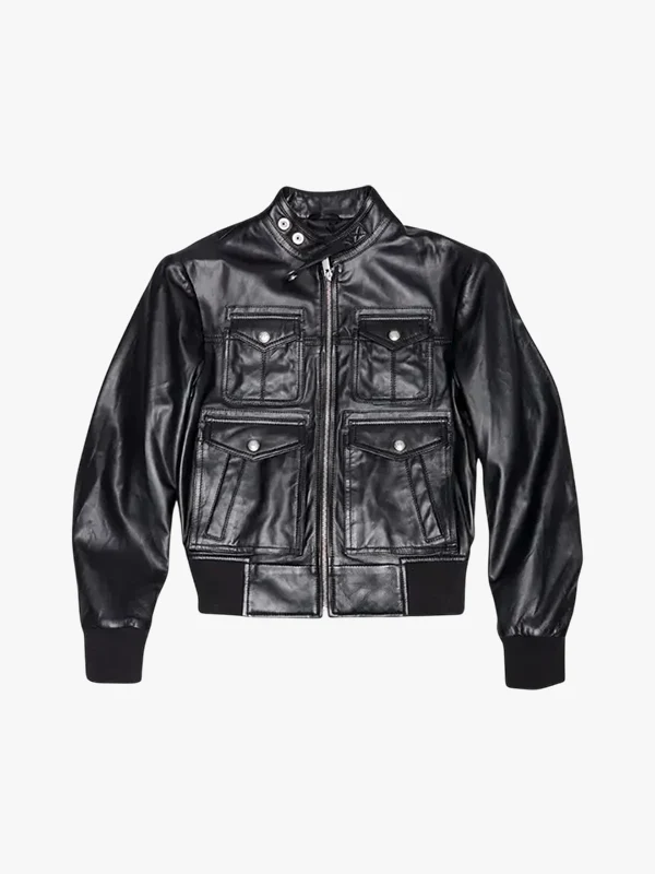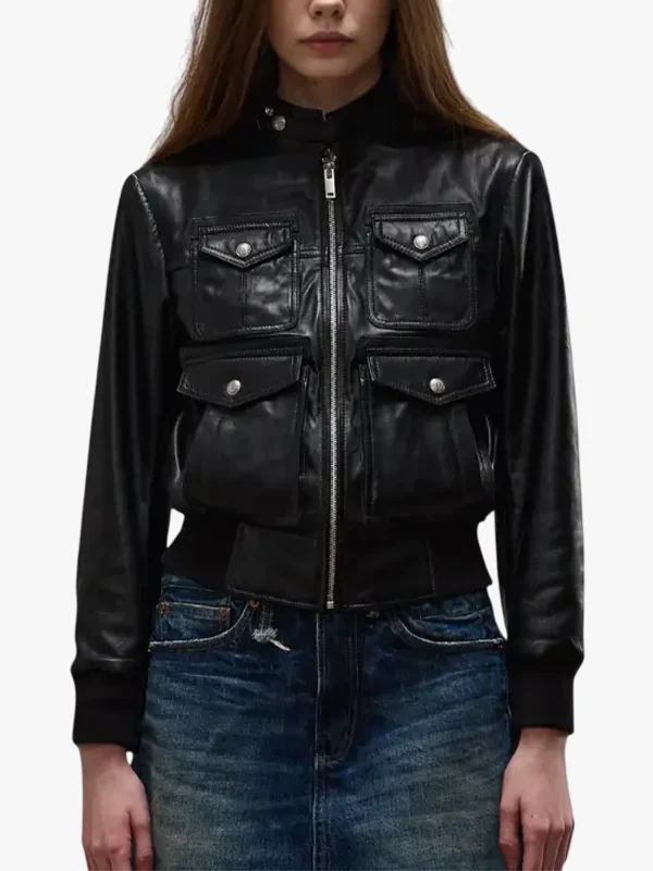 Emma Black Leather Bomber Jacket with Four-Pocket Design For Women’s