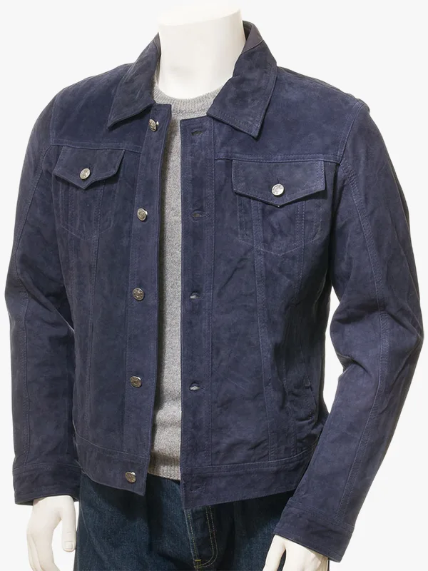 FOGGIA Blue Suede Leather Trucker Shirt Jacket For Men’s