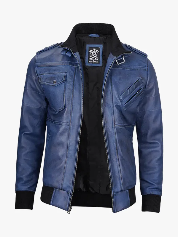 Blue Wax Leather Bomber Jacket With Removable Hood For Men’s