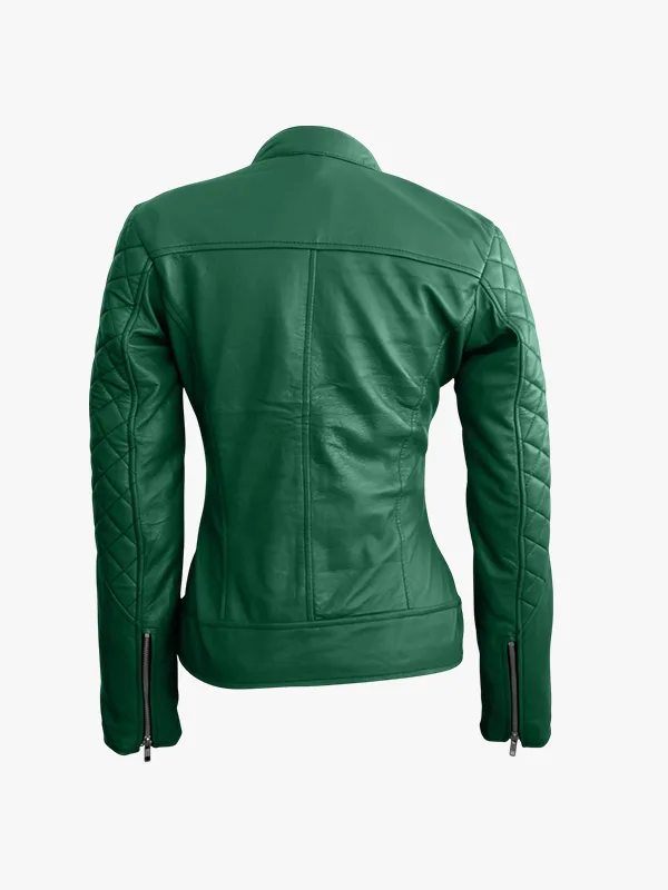 Ladies Green Leather Quilted Biker Jacket