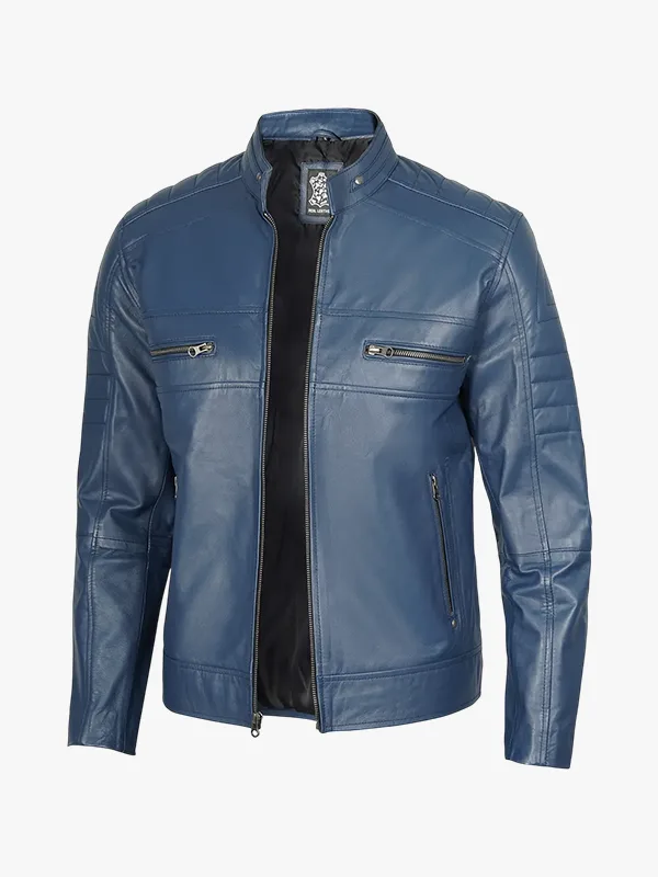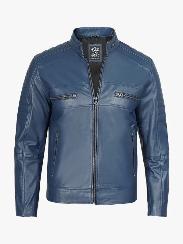 Mens Blue Cafe Racer Leather Jacket