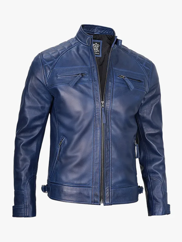 Mens Blue Quilted Leather Biker Jacket