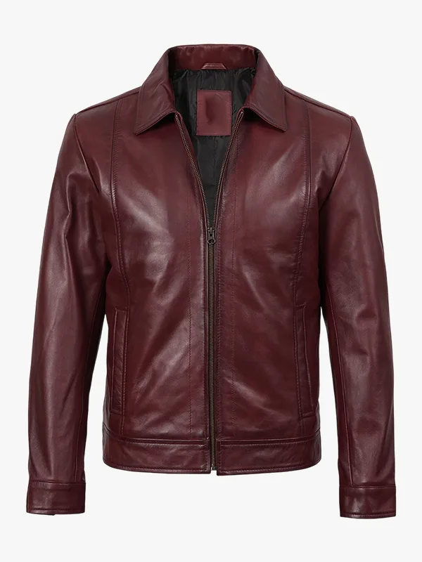 Mens Classic Shirt Collar Harrington Leather Burgundy Jacket