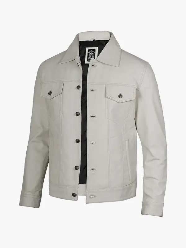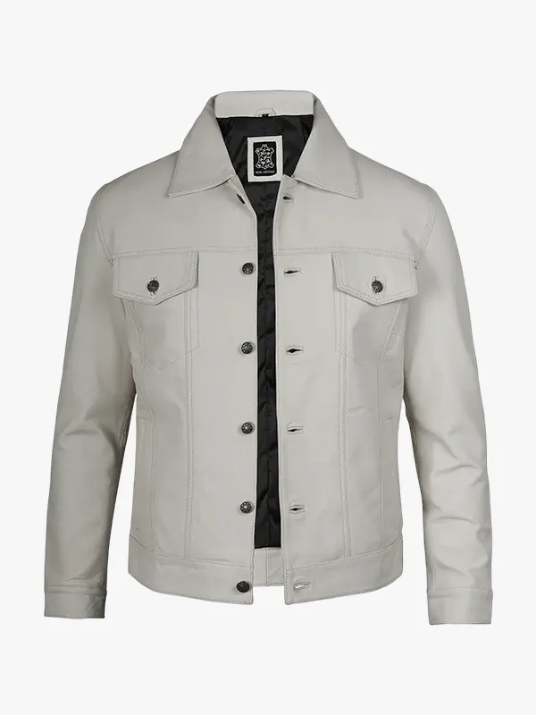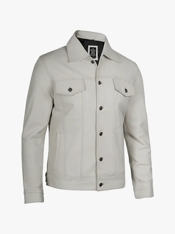 Four Pockets Off White Leather Trucker Jacket For Men’s
