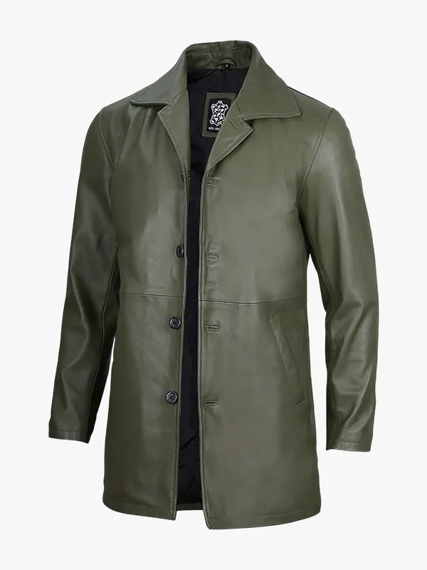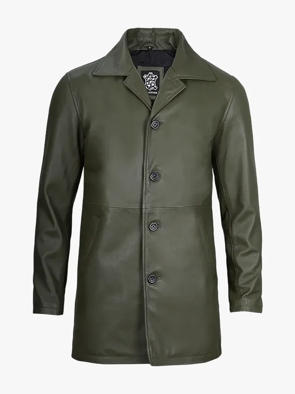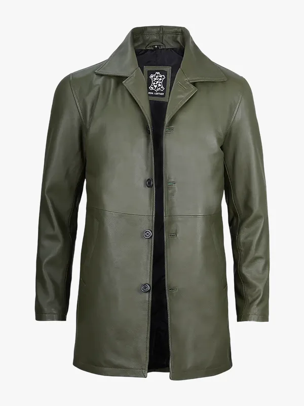 Men’s 3/4 Length Olive Green Leather Coat – Premium Quality
