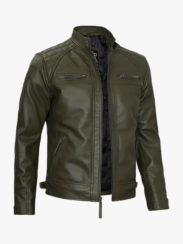 Mens Quilted Shoulder Olive Green Cafe Racer Leather Jacket
