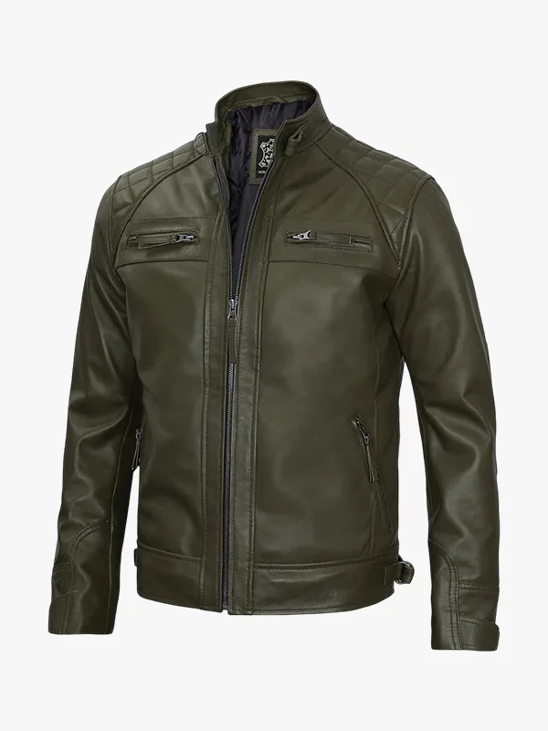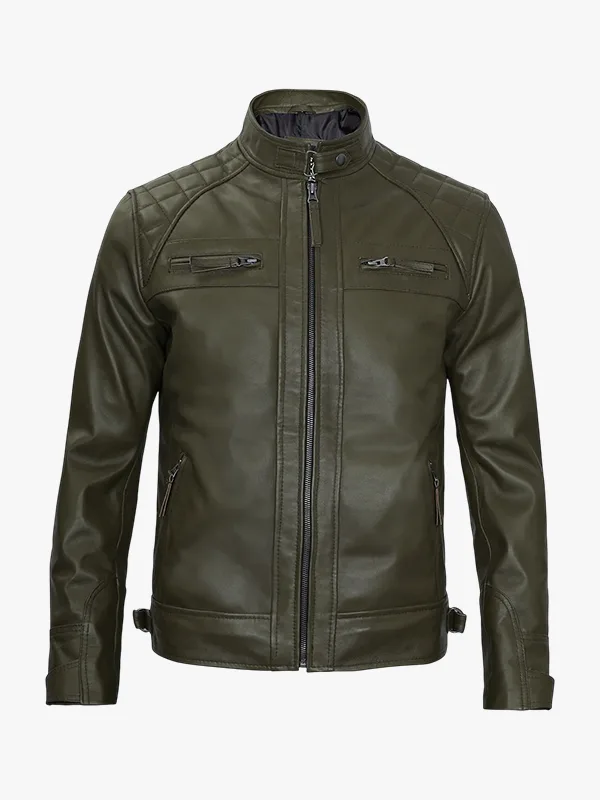 Mens Quilted Shoulder Green Leather Moto Jacket