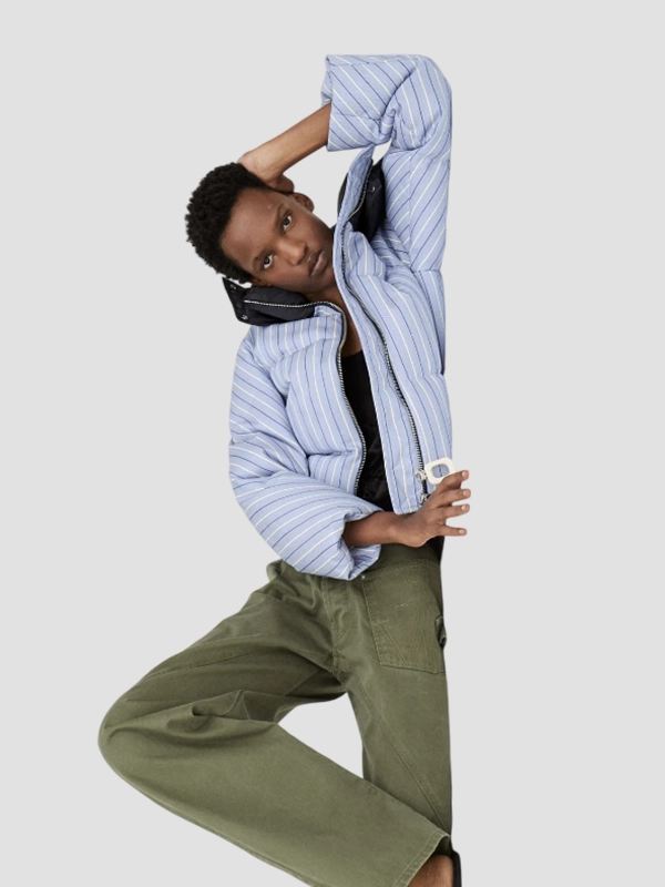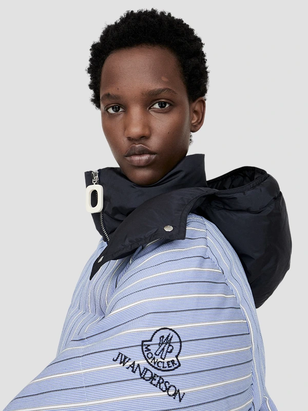 The JW Anderson × Moncler Striped Puffer Jacket in Blue blends practical insulation with clean aesthetics. The stripes aren’t just decorative, they guide the eye, giving the jacket shape and flow. You can zip it all the way up for warmth or leave it partly open to show a layer underneath. The stand-up collar provides structure even with the hood off.