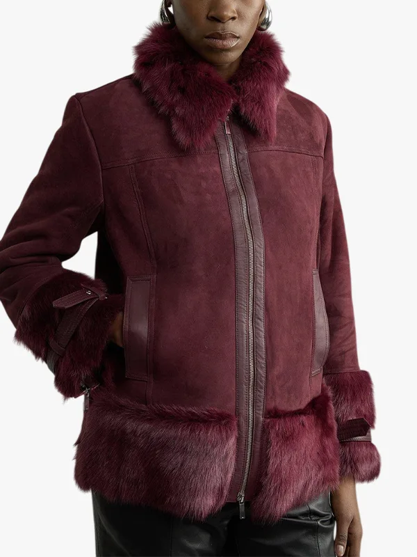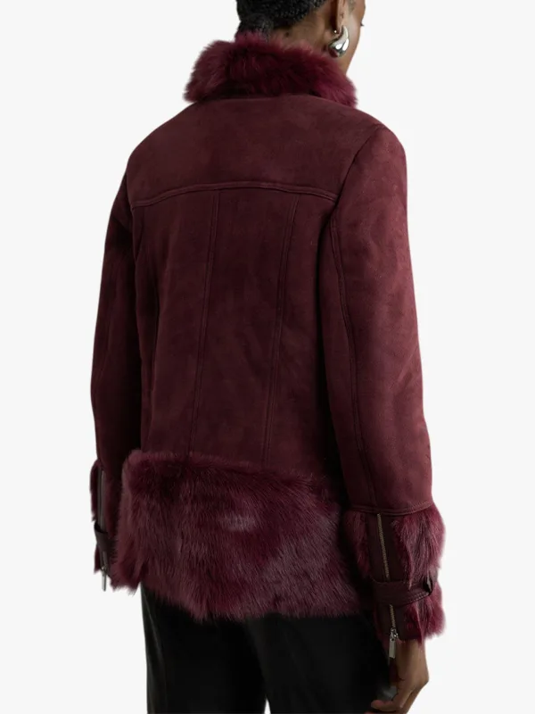 Shearling Buckle Detail Zip Through Red Jacket Coat For Women’s