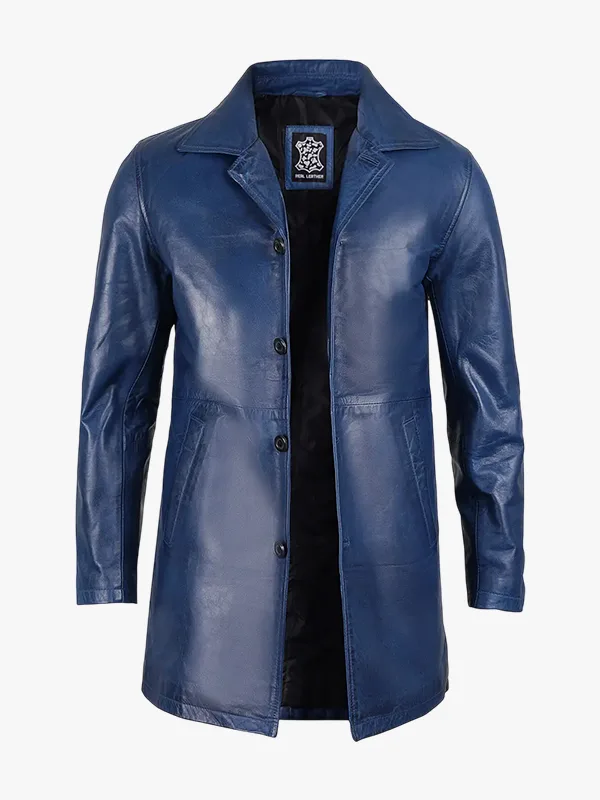 3/4 Length Blue Waxed Real Leather Coat for Men’s