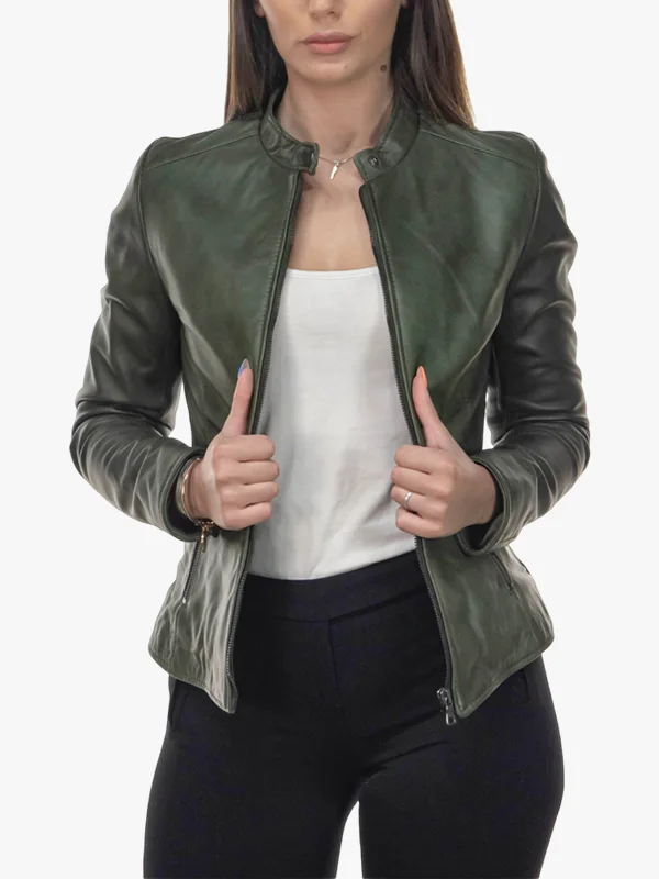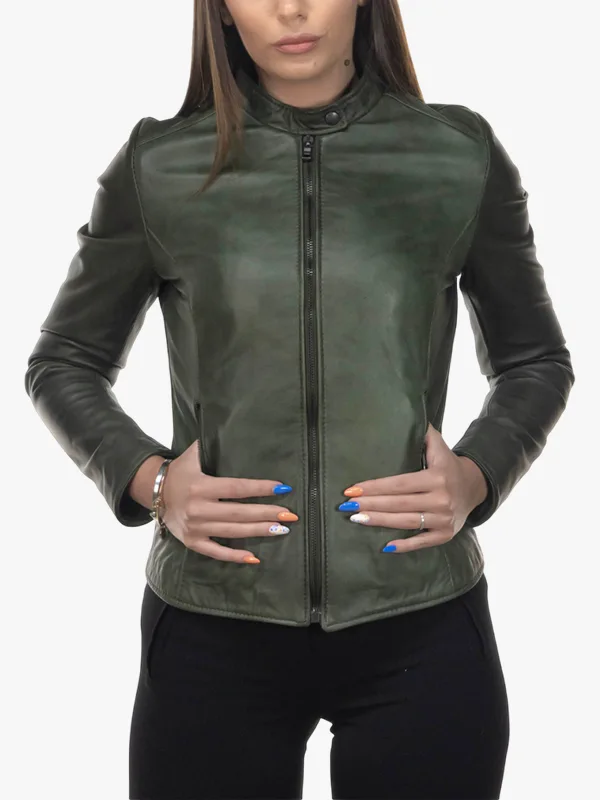 Violetta Bis Green Lambskin Cafe Racer Moto Jacket in Genuine Leather For Women’s