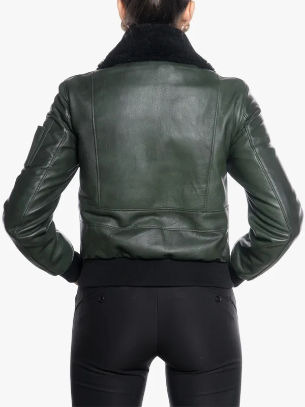 Ladies Faux Fur Collar Dark Green Leather Bomber Jacket