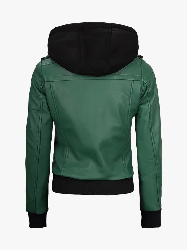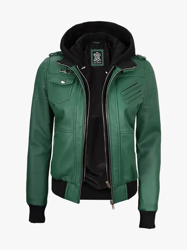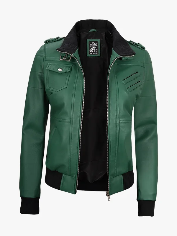 Women’s Green Lambskin Bomber Jacket With Removable Hood