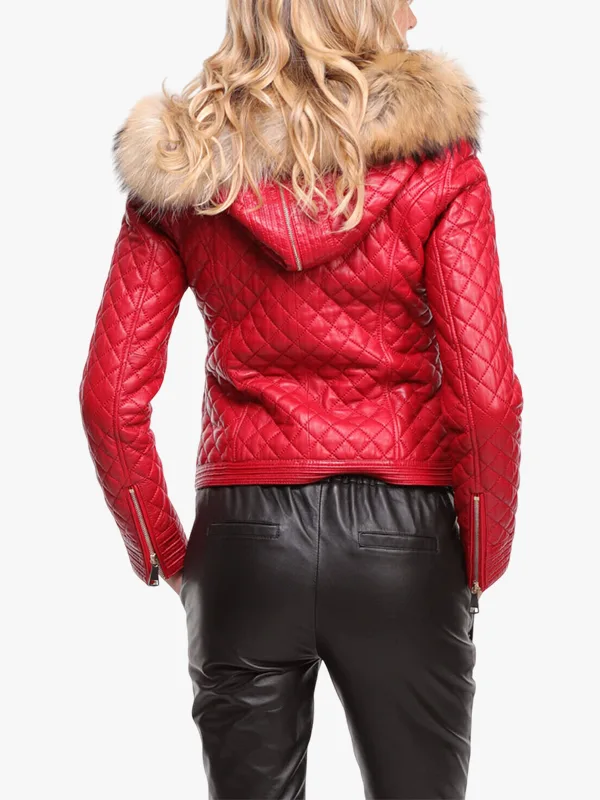 Faux Fur Hood Red Leather Quilted Jacket Women’s