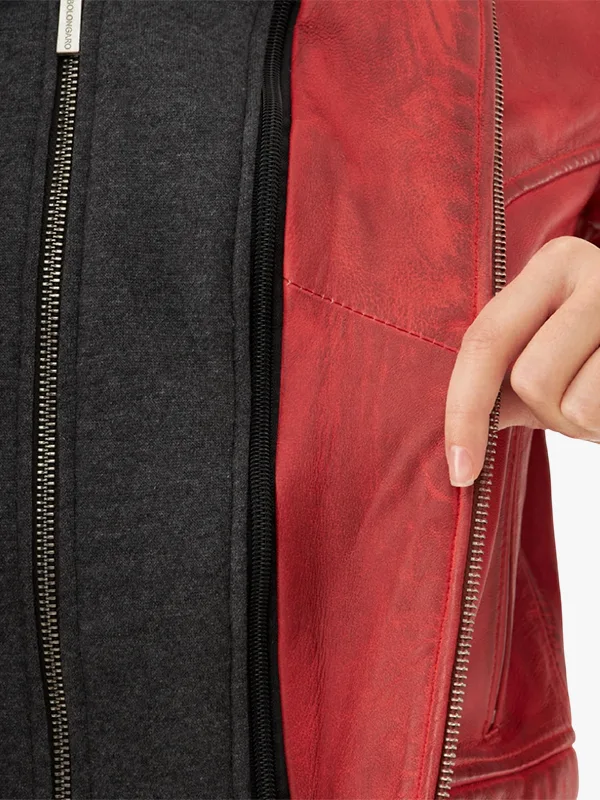 Unisex Inferno Whirl Ladies Red Leather Distressed Biker Hooded Jacket