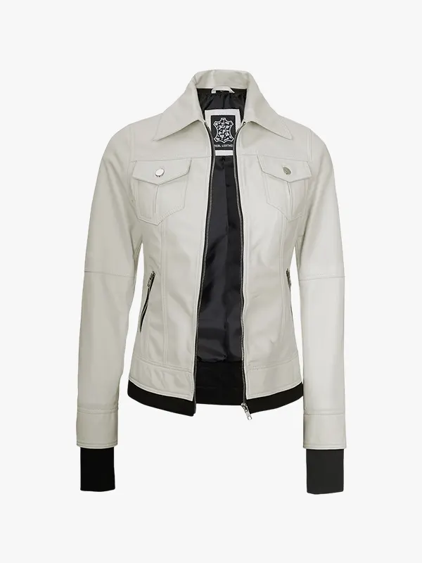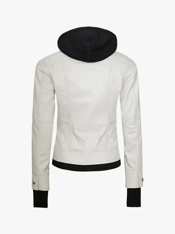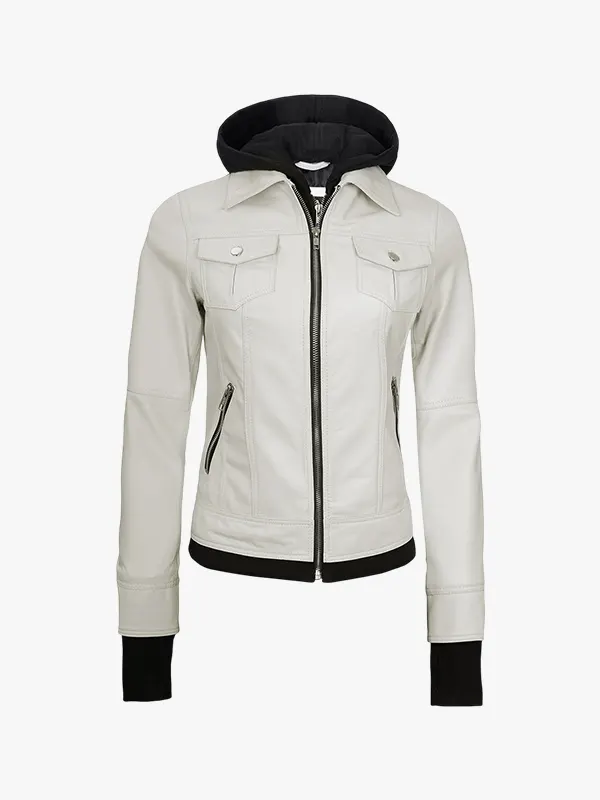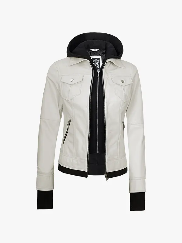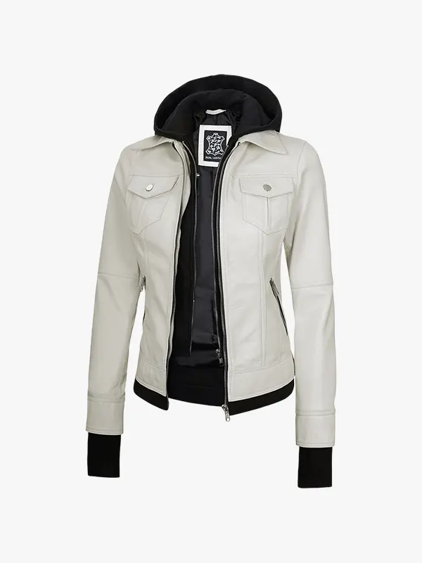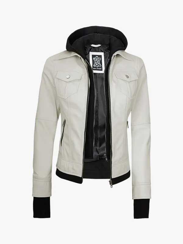 Women’s Off White Bomber Leather Jacket with Removable Hood